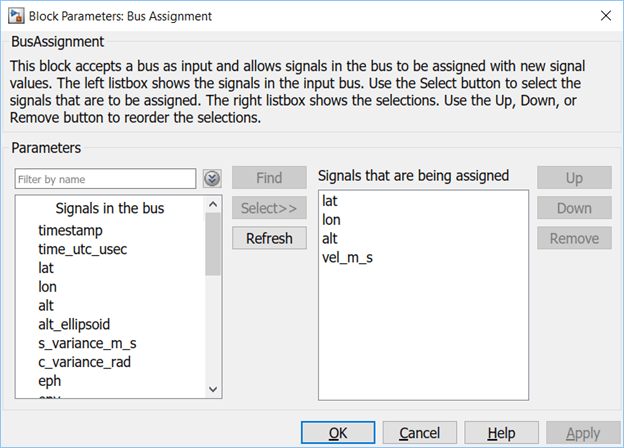 6. Double-click the Bus Assignment block. Select ???signal1 in the list on the right, and click Remove. Select the lat, lon, alt, and terrain_alt signals in the list on the left, and click Select to move them to the right. Click OK to close the dialog box.