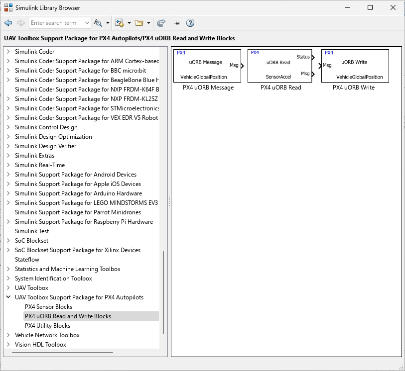 1. On the Simulink toolstrip, from the Simulation tab select Library Browser to open the Simulink Library Browser. Click the UAV Toolbox Support Package for PX4 Autopilots tab (you can also enter the command px4lib in MATLAB command window). Select the PX4 uORB Read and Write Blocks category.