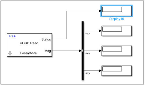 The PX4 uORB Read block outputs the most-recently received message for the topic on every time step. The Status output indicates whether the message has been received during the prior time step. For the current task, the Status output is not needed, and you can terminate it.