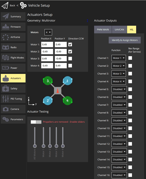 4. Configure the actuators in QGC. For more information, see Configure and Assign Actuators in QGC.