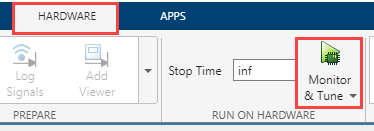 2. Click Monitor & Tune from Run on Hardware section of Hardware tab in the Simulink Toolstrip for the Controller model Quadcopter_ControllerWithNavigation