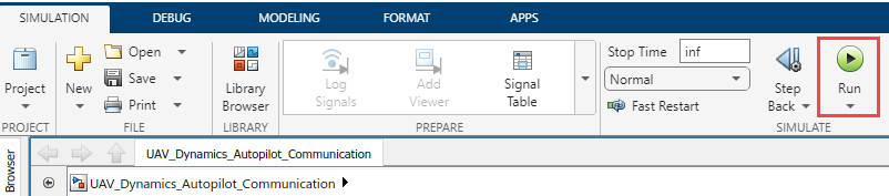 3. In the Simulink toolstrip of the Plant model (UAV_Dynamics_Autopilot_Communication), on the Simulation tab, click Run to simulate the model.