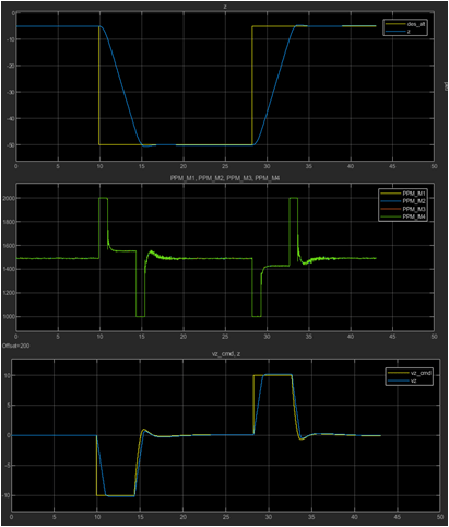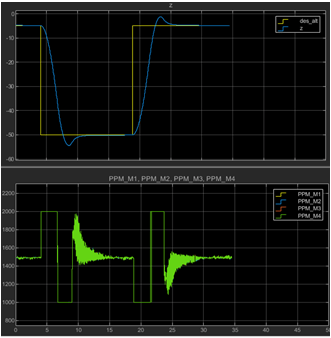 Finally, the vehicle reaches close to the desired altitude with controlled vertical velocity and further, the reduced position error results in a reduction of velocity demand. The controller adjusts actuator outputs to achieve the desired velocity.
