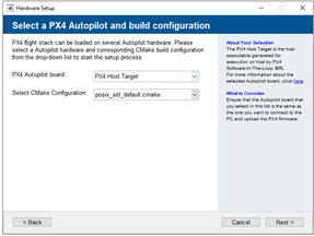 Perform the initial Setup and Configuration of the support package using Hardware Setup screens. In the Hardware Setup screen Select a PX4 Autopilot and build configuration, select PX4 Host Target as the Hardware board from the drop-down list.