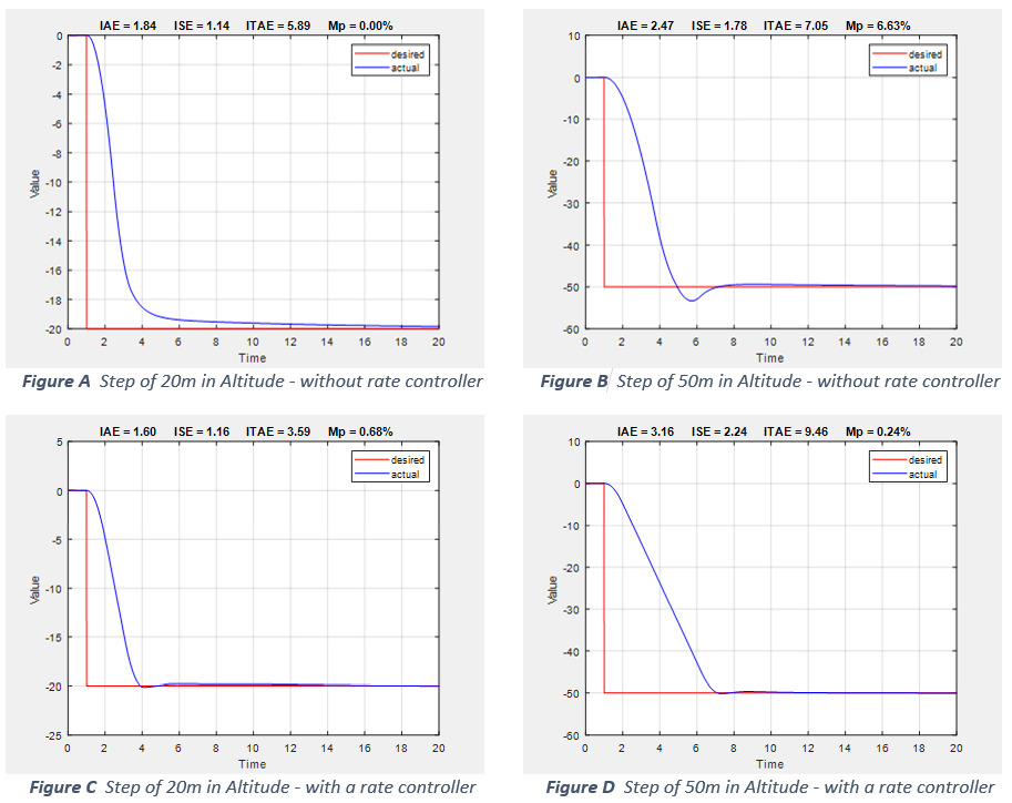 With the addition of a velocity controller in between the position controller and attitude controller, this delay reduces and the controller performance can be improved. Figure C and Figure D show the response of the vehicle to step input of 20m and 50m respectively with rate control. Here, the vehicle has the same response to both inputs without considerable overshoot.