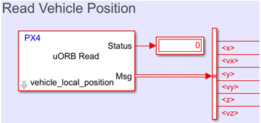 The vehicle's position in the NED reference frame and its rates can be accessed using uORB Read block, which is configured to read the message 'vehicle_local_position'.