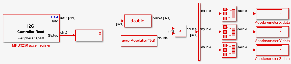 The Data Type Conversion block is used to convert the read data to double for multiplying with the accelerometer resolution(