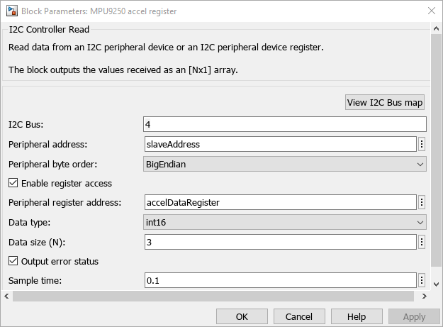 accelDataRegister(0x3B). Select the Data type asint16, Peripheral byte order asBigEndian, set Data size (N) to3, and Sample Time to0.1. This initiates an I2C read request every 0.1 second.