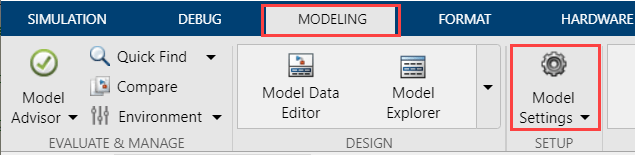 2. In your Simulink model, Open the Modeling tab and press CTRL+E to open Configuration Parameters dialog box.