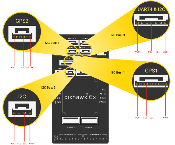 In this section, connect the MPU9250 sensor to the Pixhwak board. Decide the bus you want to connect to the I2C device. Refer to the I2C Bus Port Numbers for Labels on PX4 Autopilots for finding buses and pinout for your board. For example, consider Pixhawk 6x as the hardware board, then the bus mapping will be similar to the following image. It is recommended to connect the I2C device to the I2C specific port, that is I2C. In this example, corresponding I2C bus number is 3. If you are using a different board, see I2C Bus Port Numbers for Labels on PX4 Autopilots for buses and pinouts. Connect the sensor to corresponding pin of the I2C port. You might require a corresponding Pixhawk connector for that port. Refer to the following image for pinouts.