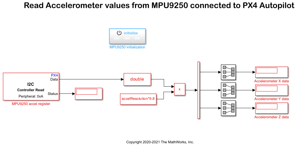 UAV Toolbox Support Package for PX4 Autopilot enables you to use the I2C interface to communicate with I2C based devices connected to the PX4 Autopilots. In this example, you will learn how to communicate with sensor MPU9250. The MPU9250 is a 9 degree of freedom (DOF) inertial measurement unit (IMU) used to read acceleration, angular velocity, and magnetic field in all three dimensions. This sensor is interfaced with the PX4 Autopilot using the I2C bus. For more information on the device, refer to the MPU9250 datasheet.