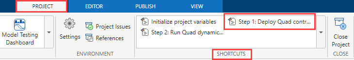1. Click Step 1: Deploy Quad controller on Host Target in the Project Shortcuts tab to open the |Quadcopter_controller | model.