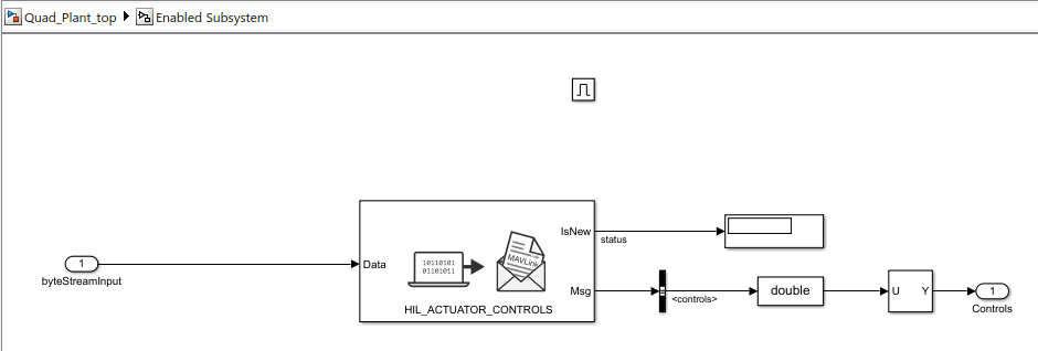 The Enabled subsystem has the MAVLink Deserializer block that extracts the HIL_ACTUATOR_CONTROLS message.