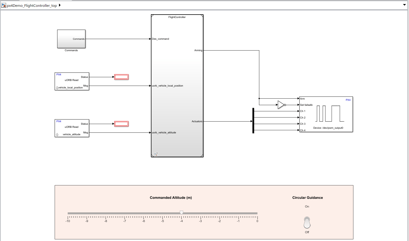 Quadcopter_controlleris the harness model that contains the flight controller. The model is set up to run with the PX4 source code by creating a PX4 Host Target executable.