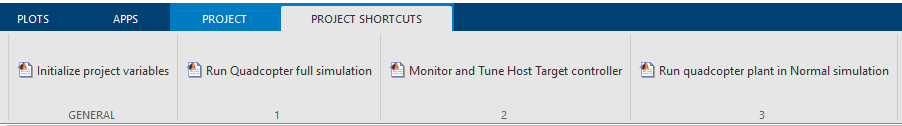 4. Click Step 2: Run Quad dynamics simulation in the Project Shortcuts tab to open the Quad_UAV_dynamics model.