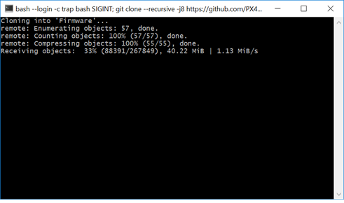 If you selected Clone PX4 repository and Start Simulation and clicked Finish, a bash shell is launched which starts cloning the firmware.