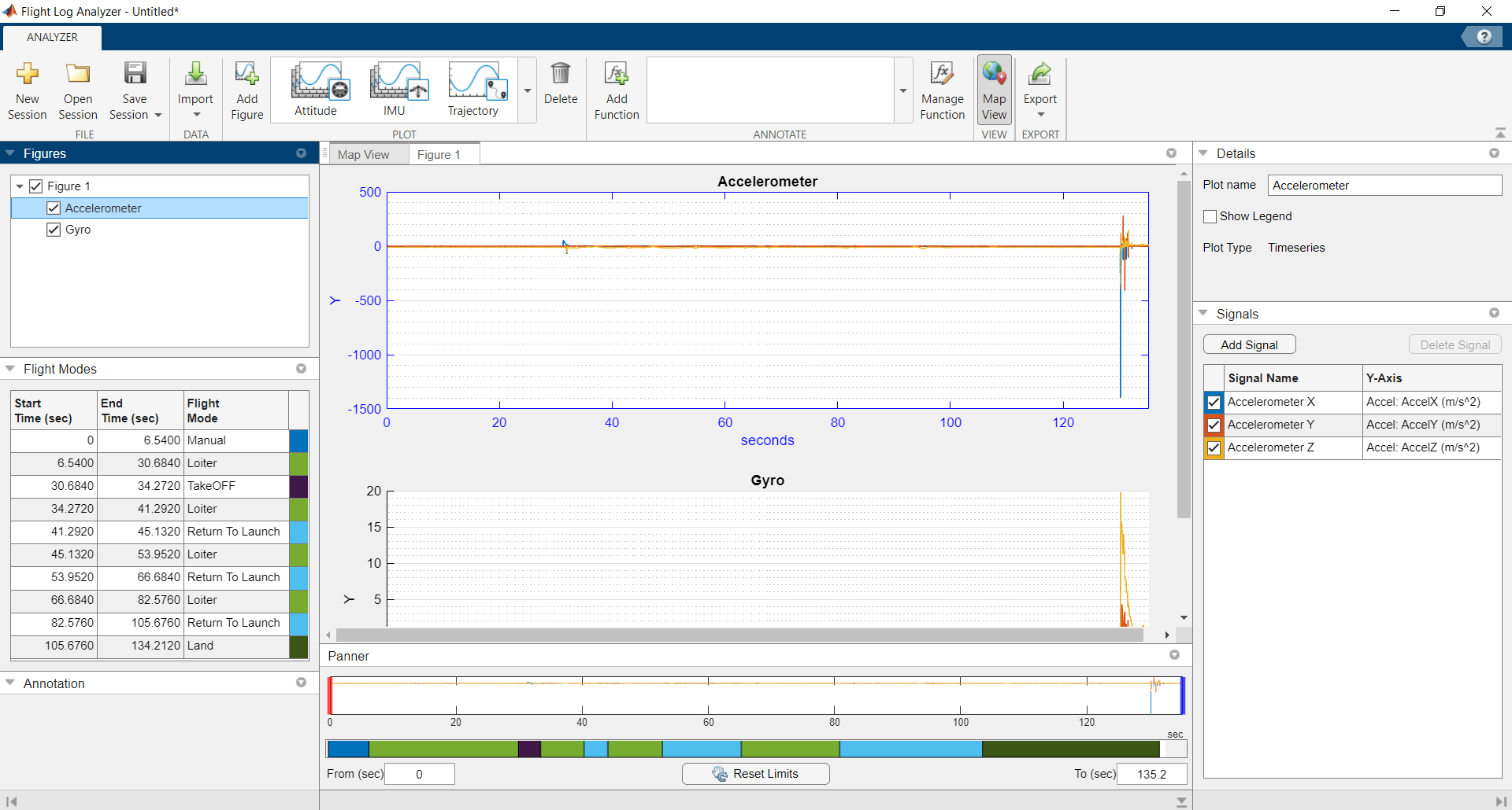 If UAV vibration is in a good range, then z-axis acceleration should remain below x-axis and y-axis acceleration. The plotted flight data indicates that, at this point in the flight, UAV vibration is in a good range. Using the Panner, focus on the other three Loiter flight modes and observe the acceleration of the UAV.