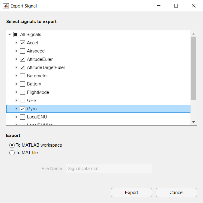 To export the signals to the MATLAB workspace, select To MATLAB workspace and specify a name for the output workspace variable.