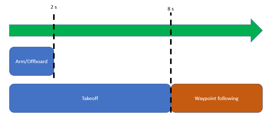 A Clock block triggers different UAV activity according to the simulation time. The model arms and enables the offboard control mode on the PX4 autopilot for the first 2 seconds. It sends out a takeoff command to bring the UAV to 1 meter above the ground for the first 8 seconds, then it engages in waypoint-following behavior.