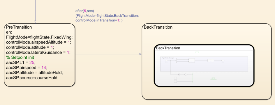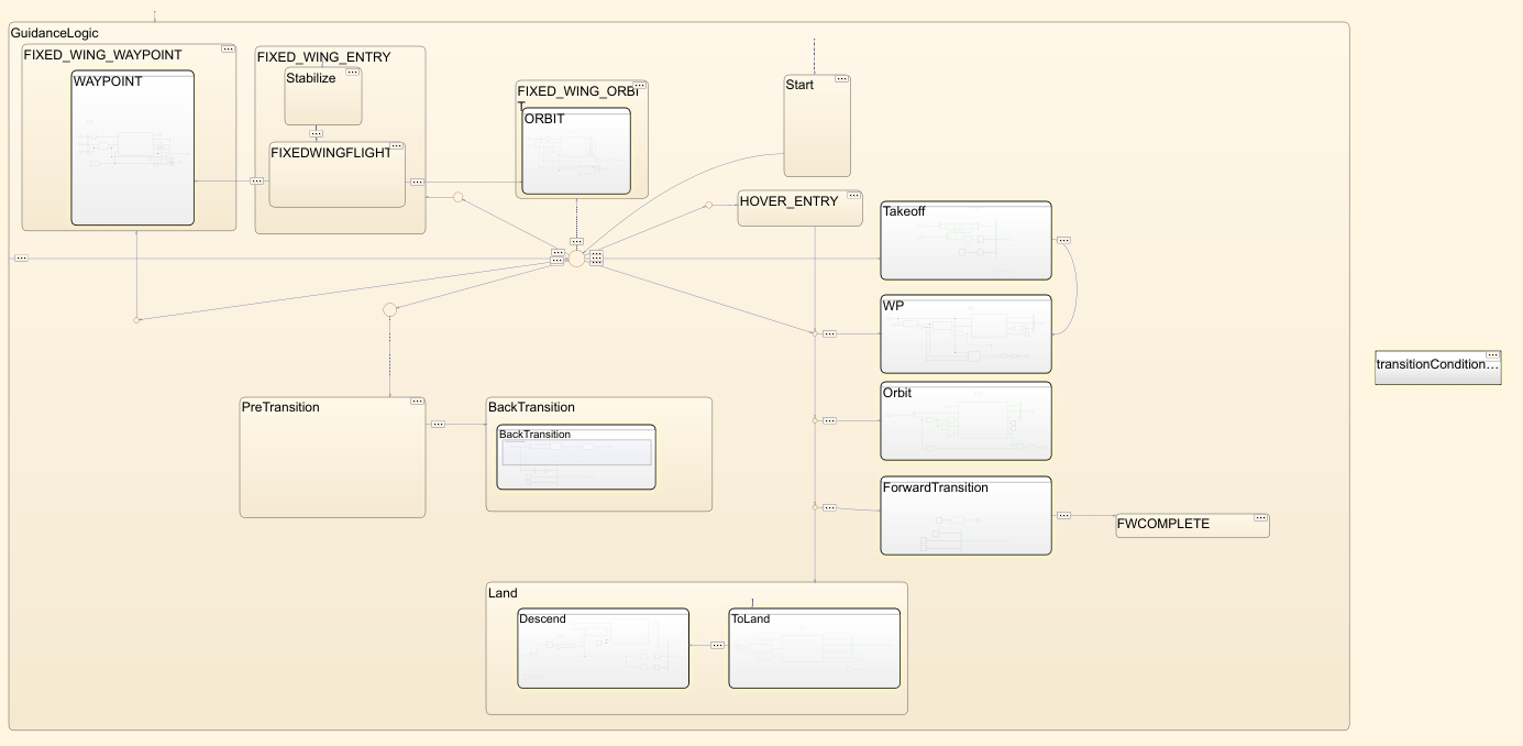For instance, this part of the diagram controls the guidance logic of the UAV before in the pre transition phase.