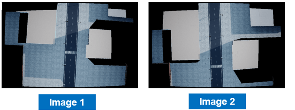3. The local pitch and yaw of the drone camera being 0 degrees and the camera having a symmetrical lens ensures that the location of the drone is actually the location of the center point of the images when they were captured. We use this information to overlap and hence register the 2 images.