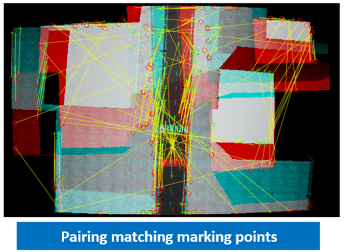 This example uses the same algorithm to create the orthomosaic as in the Create Panorama (Computer Vision Toolbox) example. However, that example stitches ground-level perspective images, rather than orthographic images, so the algorithm assumes that all pixels in the transformed images have colors (or content). This is not necessarily true for orthographic transformed images, which may have missing regions. As a result, using that algorithm for this application without modification leads to missing pixels in the stitched image. The results from the algorithm would be correct if the transformation matrices you used were perfect, but this is not possible when using automatic marking point and transformation matrix computation.