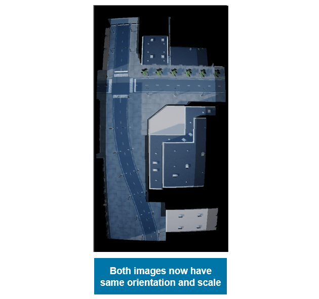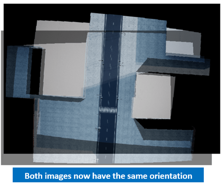 2. Rotate the two images by their corresponding roll angles so that their orientations match. Note that the yaw, pitch and elevation of drone when the two images were captured were constant. This ensures that, post rotation by their corresponding roll angle, their scale matches by default.