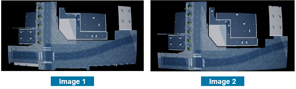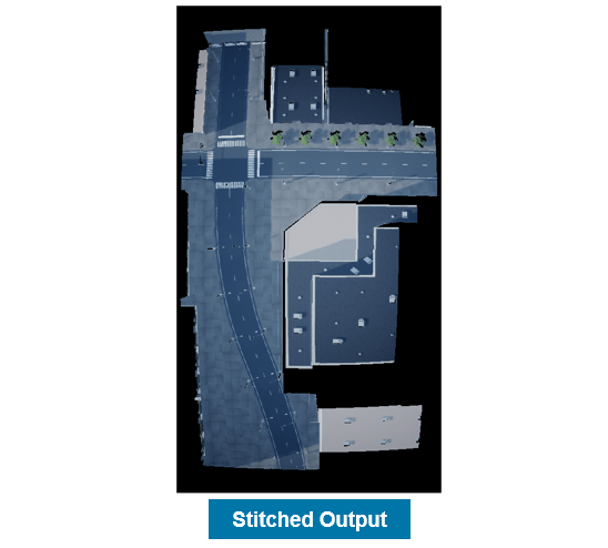 In the orthomosaic generated from the UAV flying over the US City Block scene, you might notice stitch artifacts due to the feature-based stitching not being as accurate as manual stitching. These errors, caused by incorrect feature-matches, are cumulative, which can cause incorrect stitches for long flight trajectories. Notice that due to the sole dependence on feature-matches, feature-based stitching does not provide any information about the orientation or the scale of the stitched image, which can be arbitrary.