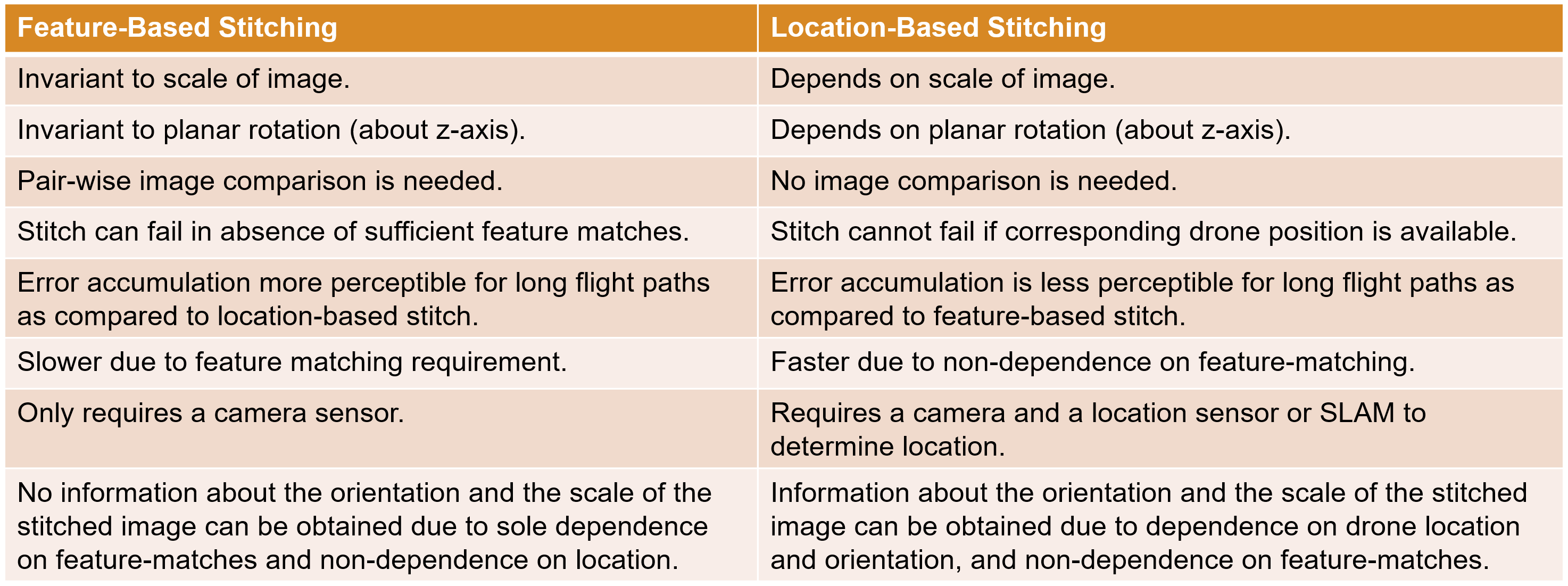 In this section we will look at location-based stitching. Although also prone to accumulation of errors, location-based stitching is more robust as in addition to the data we have seen so far, it also requires the drone's camera roll and camera location for stitching. For more information on why this is the roll and not the yaw of the camera, refer to the Survey Urban Environment Using UAV section of the Survey Urban Environment Using UAV example.