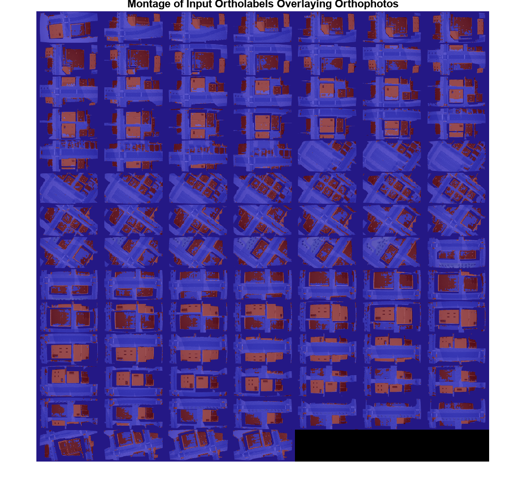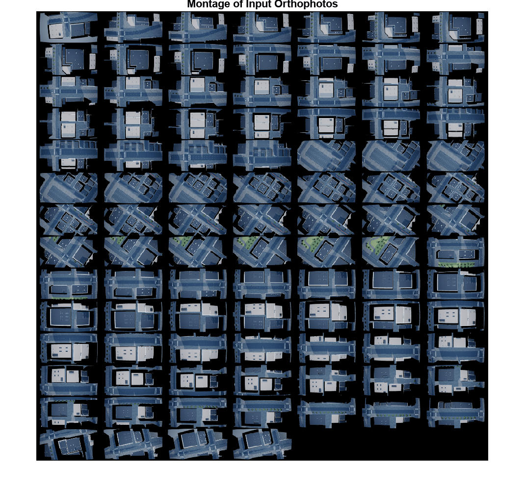 This example shows how to create an orthomosaic using feature-based and location-based image registration techniques for a given set of orthophotos. In the previous Semantic Segmentation of Orthophotos example, you obtained ortholabels for orthophotos captured from a UAV flight over a city. Now you can stitch these orthophotos along with their corresponding ortholabels to create a map for the urban environment.