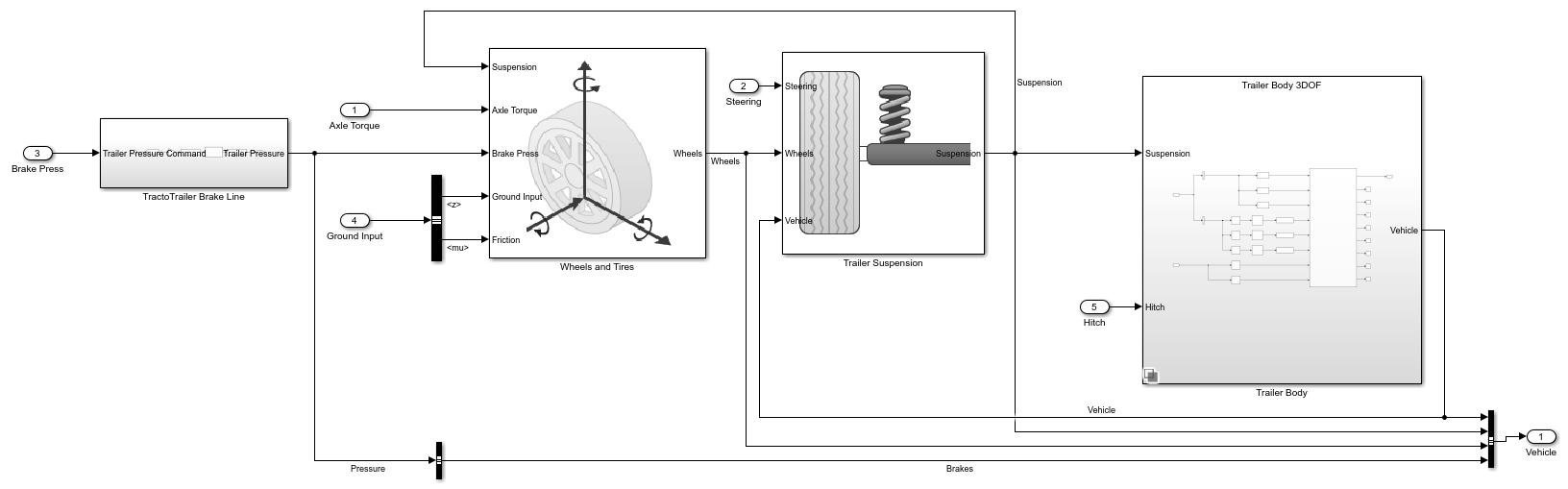 The three-axle trailer subsystem includes models for the wheels, suspension, and the trailer body.