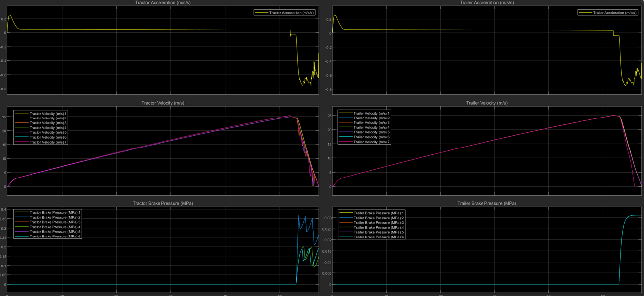 Then, on the Simulation tab, click Run. The scope block shows plots of the tractor and trailer acceleration, velocity, and brake pressure.