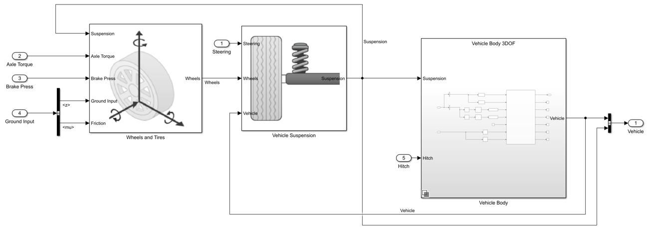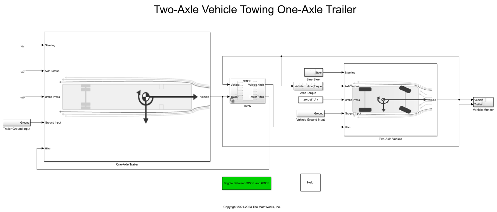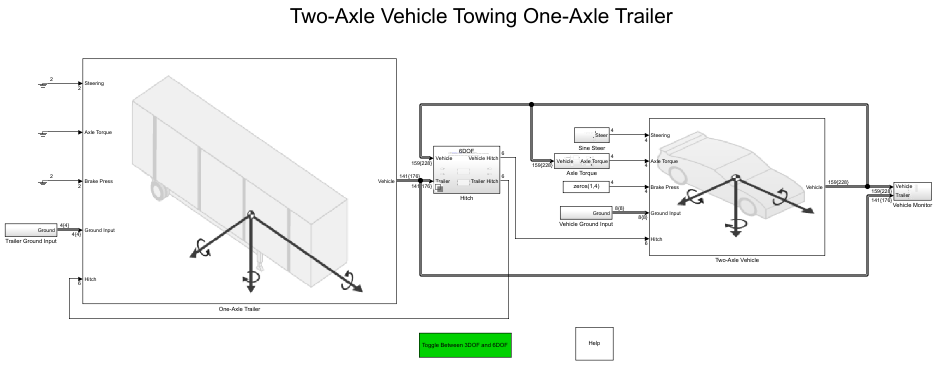To implement the tractor and trailer, by default, the three degrees-of-freedom (DOF) model uses the Vehicle Body 3DOF and Trailer Body 3DOF blocks. You can use the Toggle Between 3DOF and 6DOF button to configure a six DOF model that uses the Vehicle Body 6 DOF block, Trailer Body 6DOF block, and a hitch subsystem. See Six Degrees-of-Freedom Model.