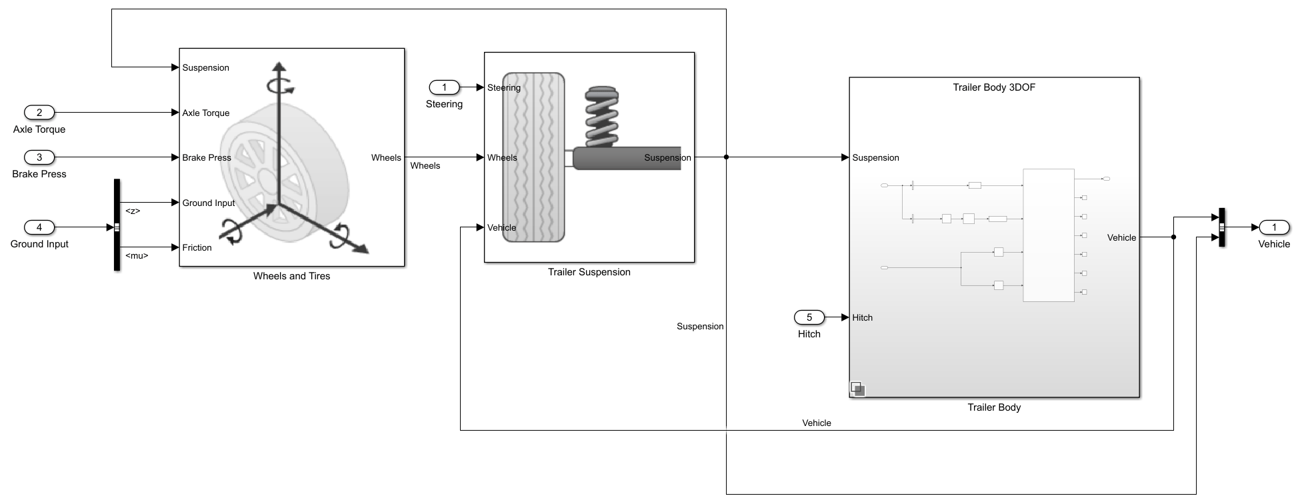 The one-axle trailer subsystem includes models for the wheels, suspension, and the trailer body.