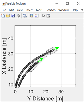 On the Simulation tab, click Run. As the simulation runs, the Vehicle Position window provides the trace of the tractor and trailer.