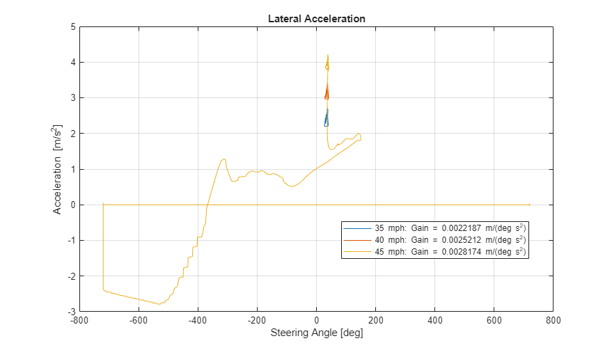 figure for idx = 1:numExperiments % Extract Data log = get(simout(idx),'logsout'); sa=log.get('Steering-wheel angle').Values; ay=log.get('Lateral acceleration').Values; firstorderfit = polyfit(sa.Data,ay.Data,1); gain(idx)=firstorderfit(1); legend_labels{idx} = [num2str(vmax(idx)), ' mph: Gain = ', ... num2str(gain(idx)), ' m/(deg s^2)']; % Plot steering angle vs. lateral acceleration plot(sa.Data,ay.Data) hold on end % Add labels to the plots legend(legend_labels, 'Location', 'best'); title('Lateral Acceleration') xlabel('Steering Angle [deg]') ylabel('Acceleration [m/s^2]') grid on