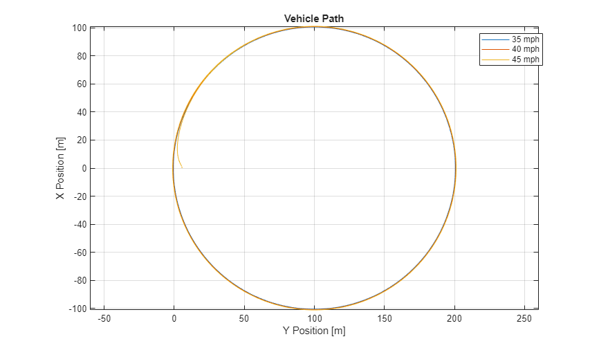figure for idx = 1:numExperiments % Extract Data log = get(simout(idx),'logsout'); xValues = getSignalsByName(simoutRun(idx), 'Passenger Vehicle:1.Body.InertFrm.Cg.Disp.X').Values; yValues = getSignalsByName(simoutRun(idx), 'Passenger Vehicle:1.Body.InertFrm.Cg.Disp.Y').Values; x = xValues.Data; y = yValues.Data; legend_labels{idx} = [num2str(vmax(idx)), ' mph']; % Plot vehicle location axis('equal') plot(y,x) hold on end % Add labels to the plots legend(legend_labels, 'Location', 'best'); title('Vehicle Path') xlabel('Y Position [m]') ylabel('X Position [m]') grid on