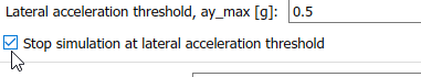 Select the Reference Generator block Stop simulation at lateral acceleration threshold parameter.