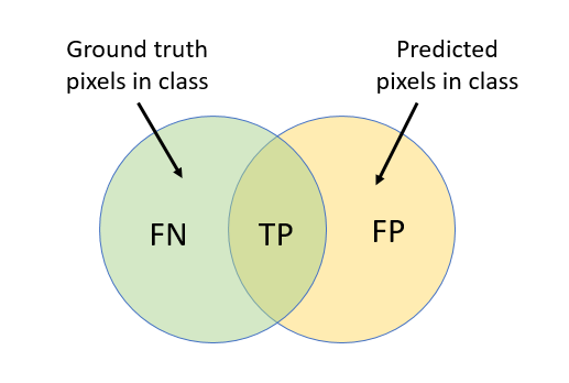 IoU— Ratio of correctly classified pixels to the total number of pixels that are assigned that class by the ground truth and the predictor. IoU can be expressed as:IoU= TP / (TP + FP + FN)The image describes the true positives (TP), false positives (FP), and false negatives (FN).