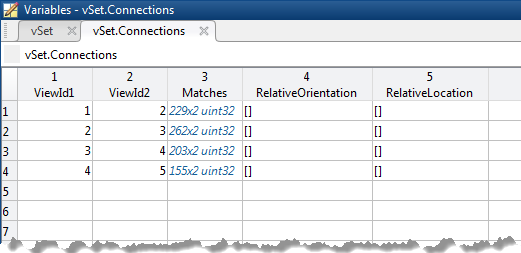 Pairwise connections between views, stored as a five-column table. The columns are ViewID1, ViewID2, Matches, RelativeOrientation, and RelativeLocation. The number of entries in the table represent the number of connections. Each index in the Matches column represents a connection between the two views indicated by the view IDs.