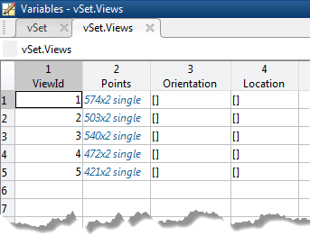 A viewSet object stores views and connections between views. A view includes feature points and an absolute camera pose. A connection between two views includes point correspondences and the relative camera pose between them. Once you populate a viewSet object, you can use it to find point tracks across multiple views and retrieve the camera poses to be used by the triangulateMultiview and bundleAdjustment functions.