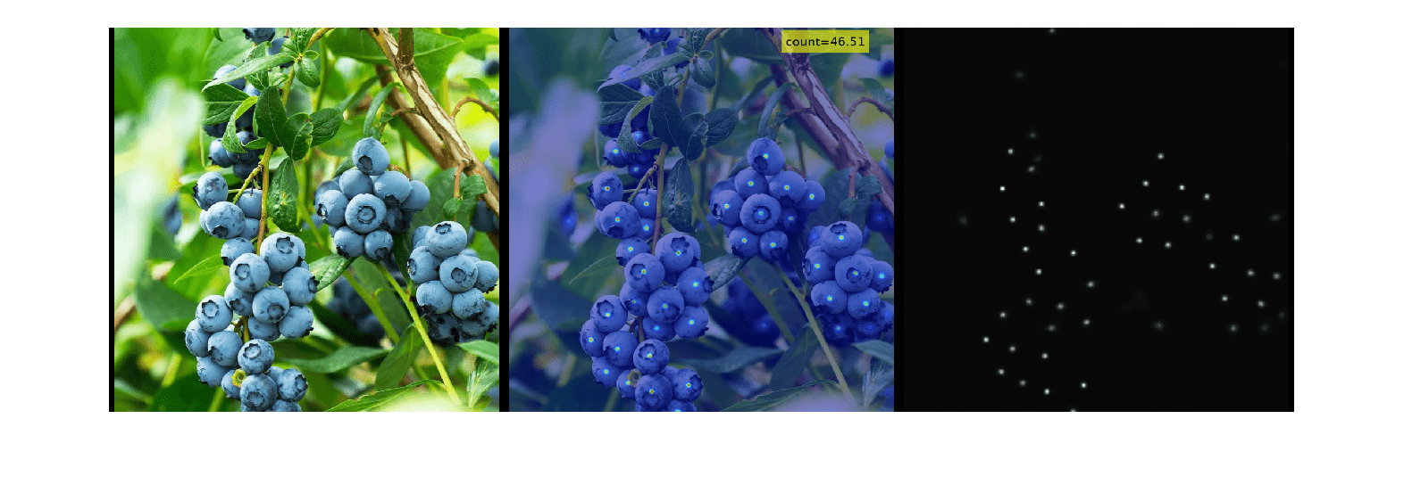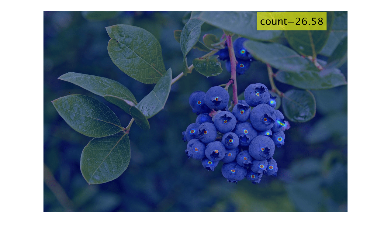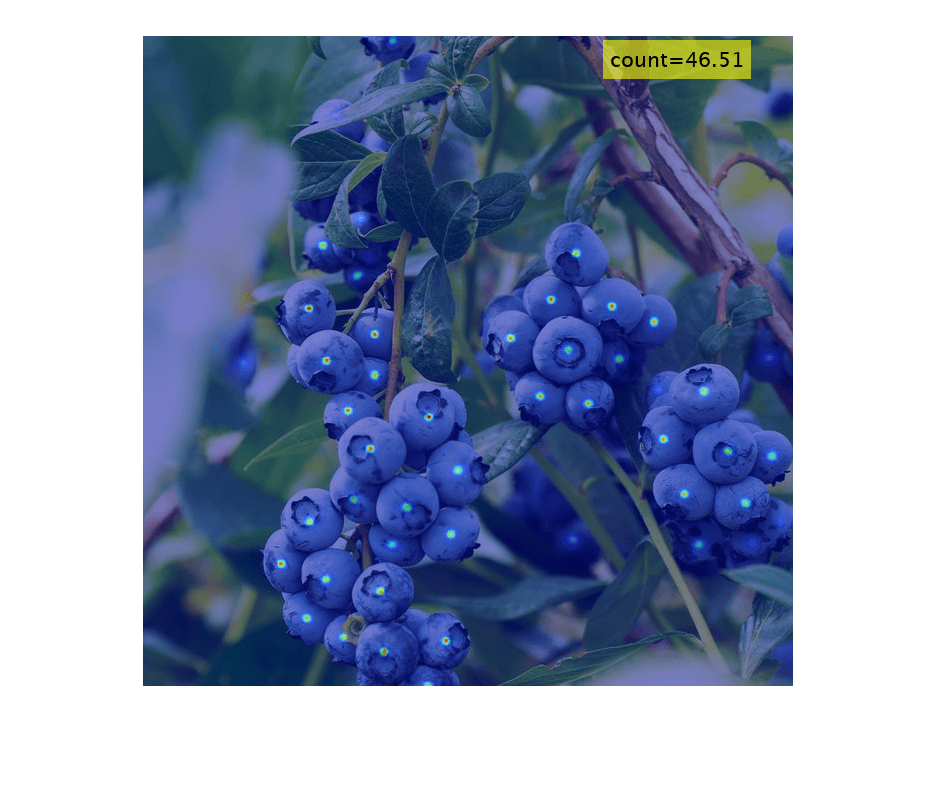 This visualization demonstrates the CounTR model's effectiveness in detecting the majority of blueberries, including those that are occluded or partially visible. Although the intensity for occluded and partial blueberries may be lower in the density map, they still contribute to the overall count.