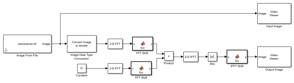 The model uses 2-D FFT blocks to compute two-dimensional fast Fourier transforms of the input image and filtering mask. The FFT Shift blocks are MATLAB Function (Simulink) blocks that shift the zero-frequency component to the center of the spectrum. To apply the filter, the model multiplies the spectra of the input image and filtering mask using the Product block. Then, the model computes 2-D inverse Fast Fourier Transform (IFFT) of the resulting product using the 2-D IFFT block and finds its absolute value using the Abs (Simulink) block. Finally, the model uses IFFT Shift block to undo the effect of FFT shift operation and rearrange the output image.