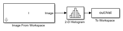 Open the Simulink® model. The model reads the image stored in variable I from the MATLAB workspace. The Upper limit of histogram parameter of the 2-D Histogram block is set to the maximum value of the intensity image. The Number of Bins parameter of the 2-D Histogram block is set to 128 and the histogram is computed for the entire input.