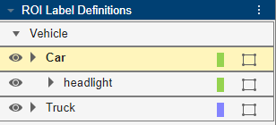 Rectanglesublabel namedheadlightand optionally write a description. Click OK.The headlight sublabel appears in the ROI Labels Definitions pane. The sublabel is nested under the selected ROI label, Car, and has the same color as its parent label.