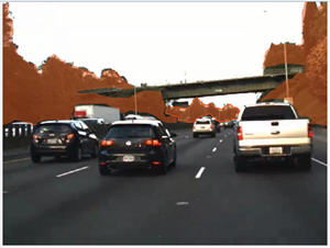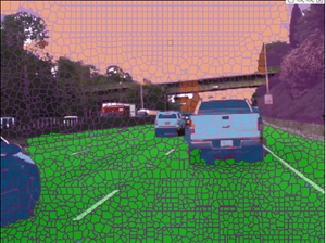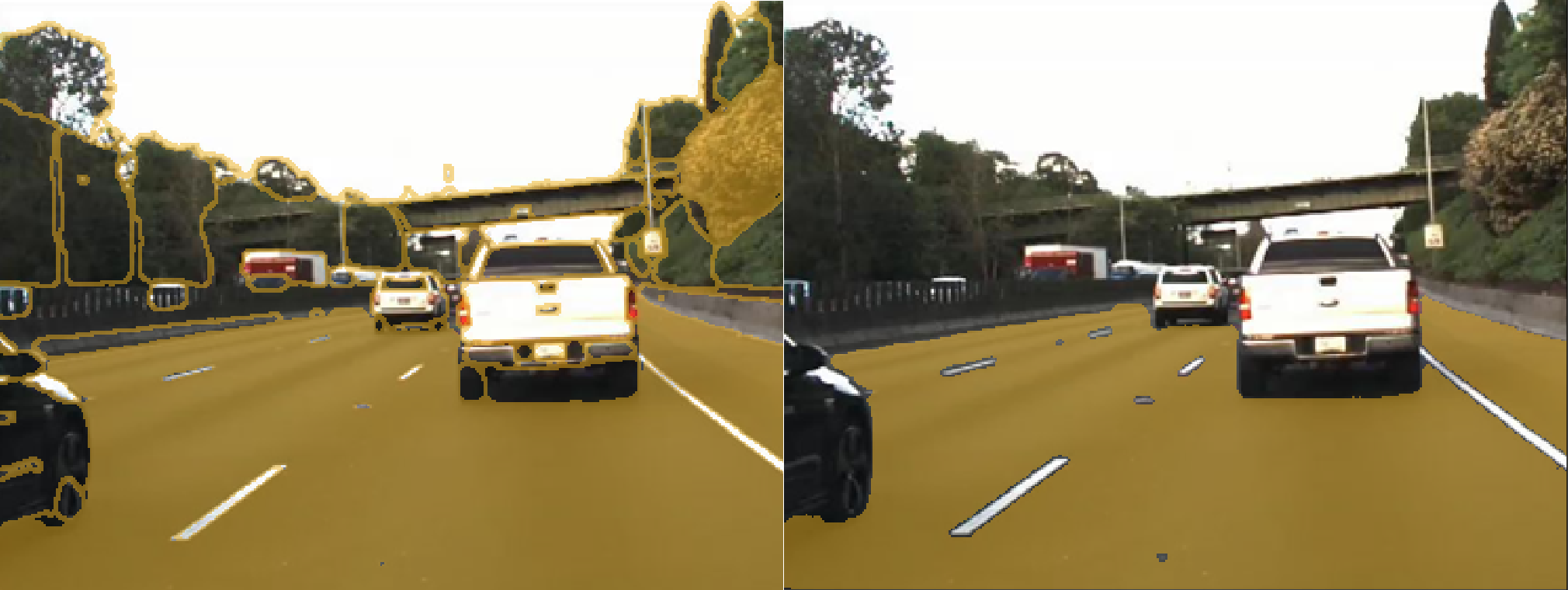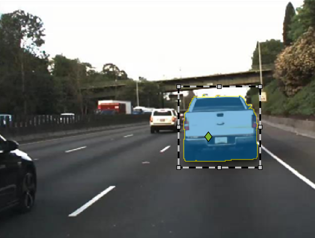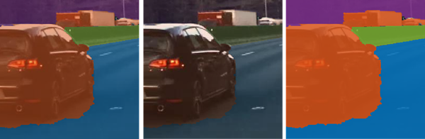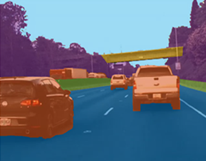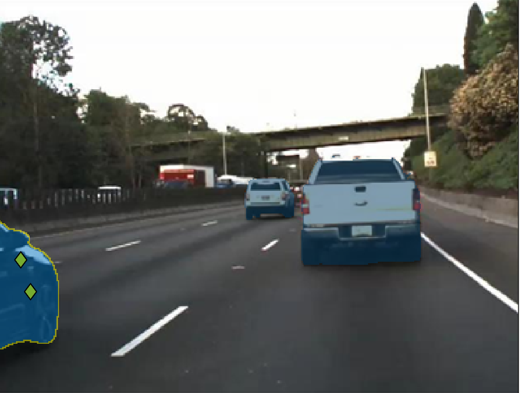 • Increase the opacity to see the segmentation more clearly. For instance, increase the opacity to see that edge along the front bumper of the car should be smoothed. Also, observe that the barrier and some distant vehicles have unlabeled pixels.