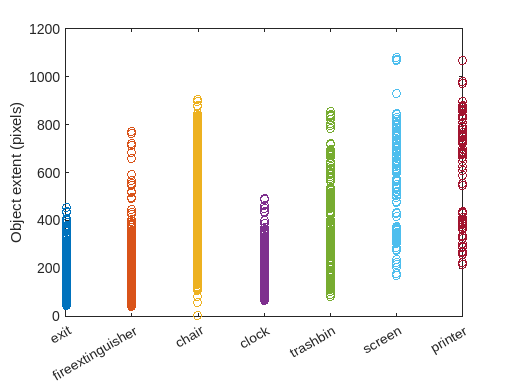 figure classes = tbl.Label; numClasses = numel(classes); for i = 1:numClasses len = groupedDiagonalLength{i}; x = repelem(i,numel(len),1); plot(x,len,"o") hold on end hold off ylabel("Object extent (pixels)") xticks(1:numClasses) xticklabels(classes)