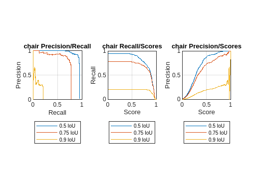 overlapThresholds = metrics.OverlapThreshold; iou =overlapThresholds(1); selectedClasses = ["chair","clock","trashbin"]; % Extract precision and recall values [precision,recall,scores] = precisionRecall(metrics,OverlapThreshold=iou,ClassName=selectedClasses); % Plot precision-recall curves. figure tiledlayout(1,3) nexttile % plot P-R curves for all classes at that IoU for c = 1:length(selectedClasses) plot(recall{c},precision{c}) hold on end ylim([0 1]) xlim([0 1]) xlabel("Recall") ylabel("Precision") grid on axis square title("Precision/Recall") legend(selectedClasses,Location="southoutside")