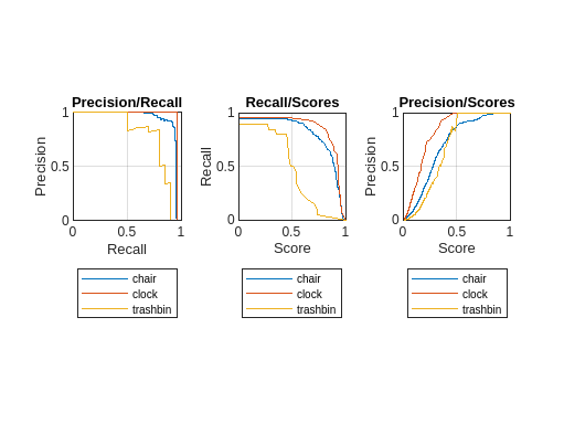 The figure shows the performance of the selected classes at each precision and recall value, and can help determine the detector threshold that results in sufficiently high precision while maintaining a minimum recall of 0.8. In this case, a detection score threshold of 0.5 is suitable for the chair and clock classes, but causes the recall for the trash bin class to fall below the desired limit, which you can see in the Recall/Scores plot. A lower threshold of 0.4 satisfies these conditions for the selected classes.