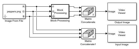Run the model. The model uses two Matrix Concatenate (Simulink) blocks to concatenate the color channels of the input and output images. It then displays the input image and the resized output image using Video Viewer blocks.
